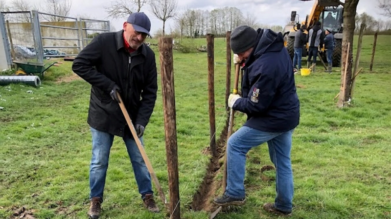 “Al enkele weekends zijn we met een tiental leden actief”, vervolgt voorzitter Johnny, “en steken we de handen uit de mouwen om het weiland in te delen voor het houden van schapen en geiten”. Ruim 300 weidepalen werden geplaatst, 400 meter schapendraad gespannen en 150 meter draad voor de geitenwei. “De schilders onder ons”, vervolgt de voorzitter, “hebben de oude koeienstal bij wijze van spreken omgetoverd tot een mooie geitenstal en voorzien van een fris kleurtje”.