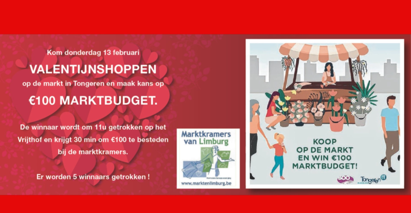 De stad Tongeren organiseert op donderdag 13 februari de actie ‘Valentijnshoppen’ op de wekelijkse donderdagmarkt. Wie op 13 februari op de donderdagmarkt koopt maakt kans op een marktbudget van 100 euro.